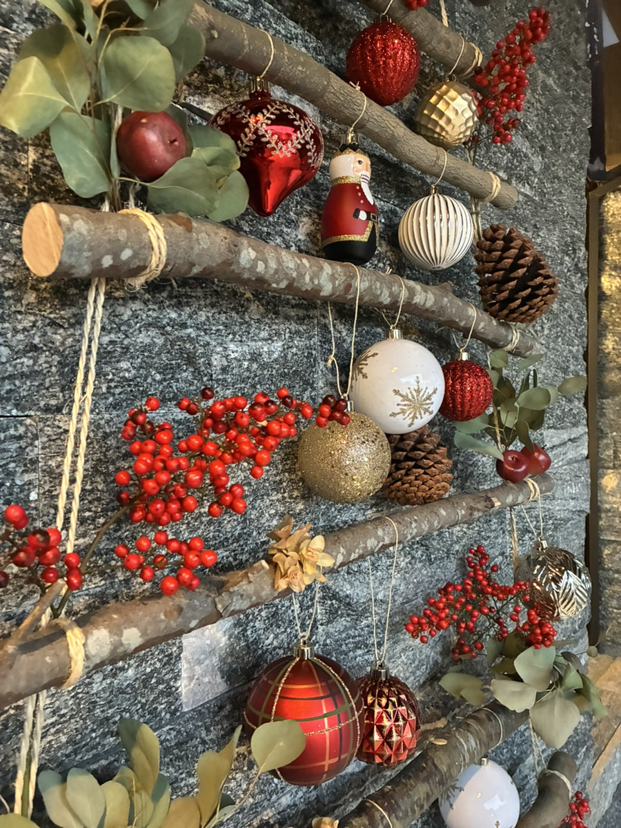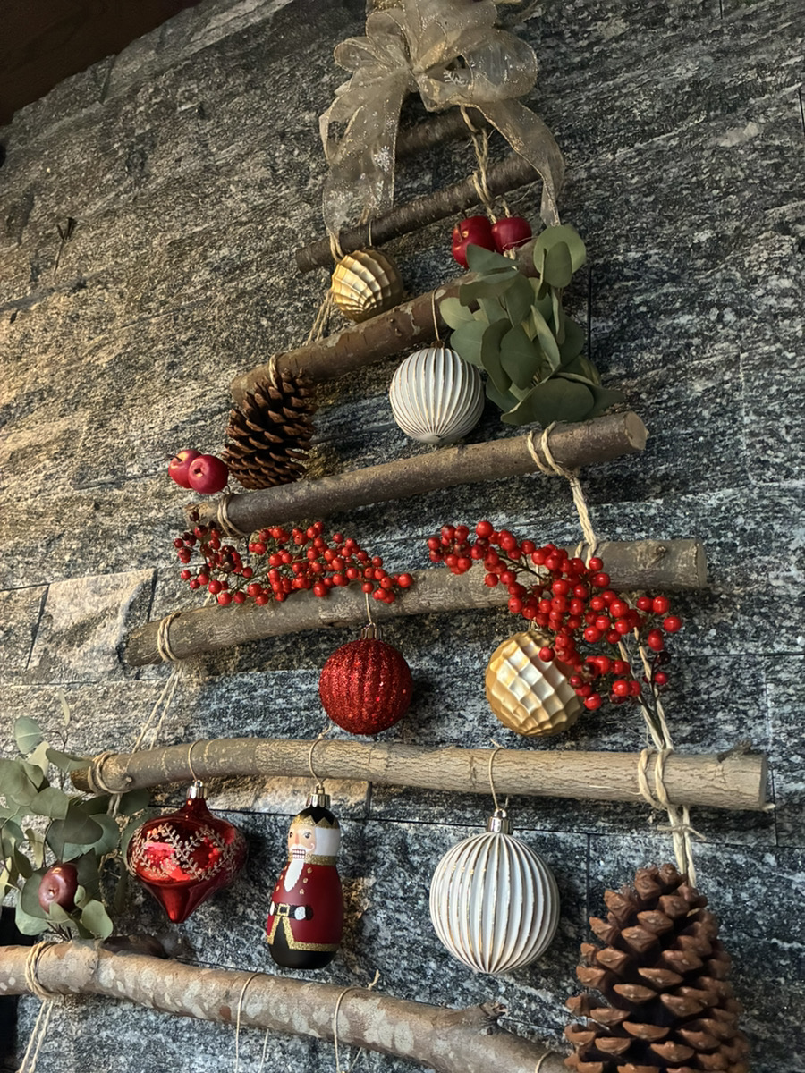 今年は木を組み合わせてオーナメントを飾ったオシャレな壁掛けツリーです。