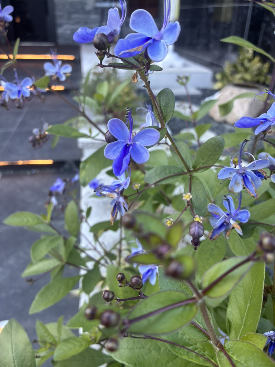 クマツヅラ科の常緑低木で、青い蝶のような小さな花が咲きます。花の姿が蝶に似ていることから、英名がブルーバタフライブッシュなどと呼ばれています。