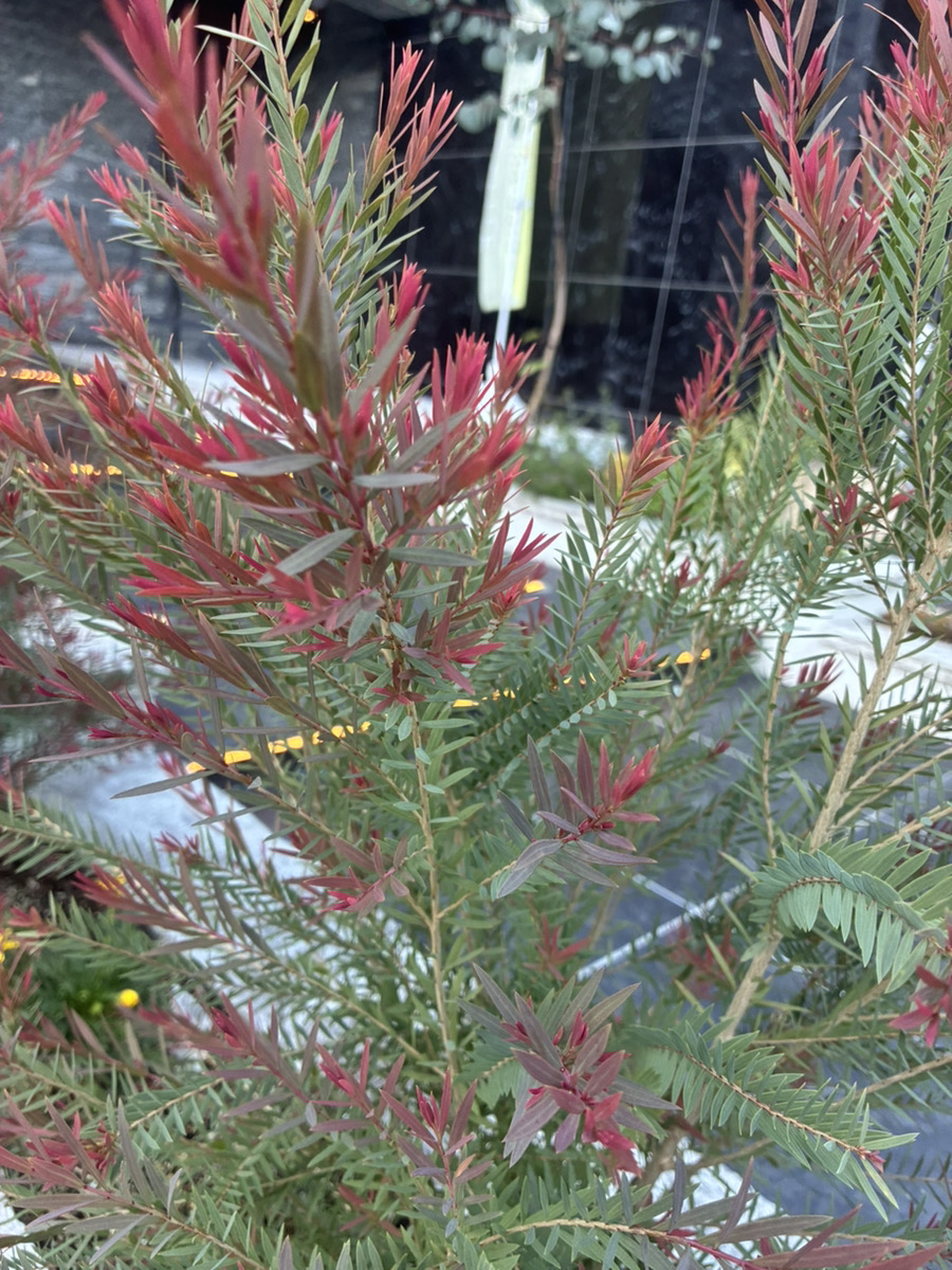 先端部分が赤くなる常緑低木です。秋から初冬の寒さに当たると赤みが更に色づいていくそうで、楽しみです♪
