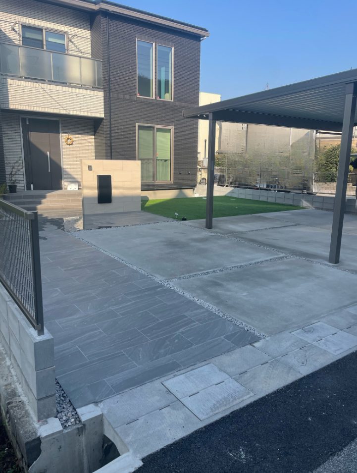 カーポートと土間コンクリート。 スリットが入っており砂利を敷くことでデザイン性、水はけも◎