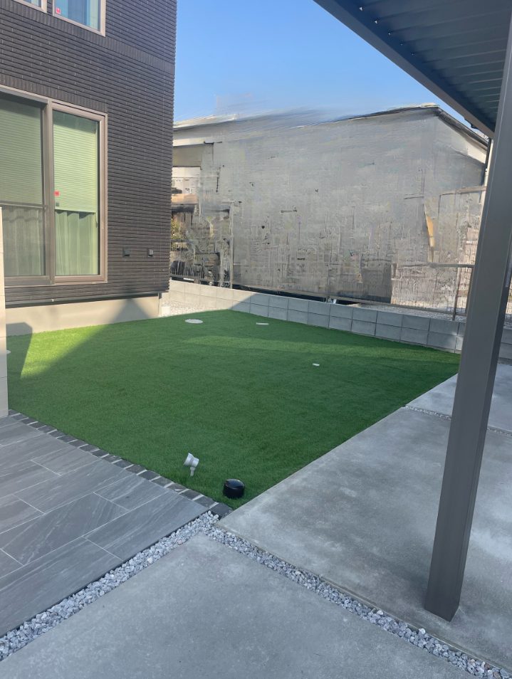 カーポートの後ろは人工芝を敷いてます。一年中緑を楽しめますよ。