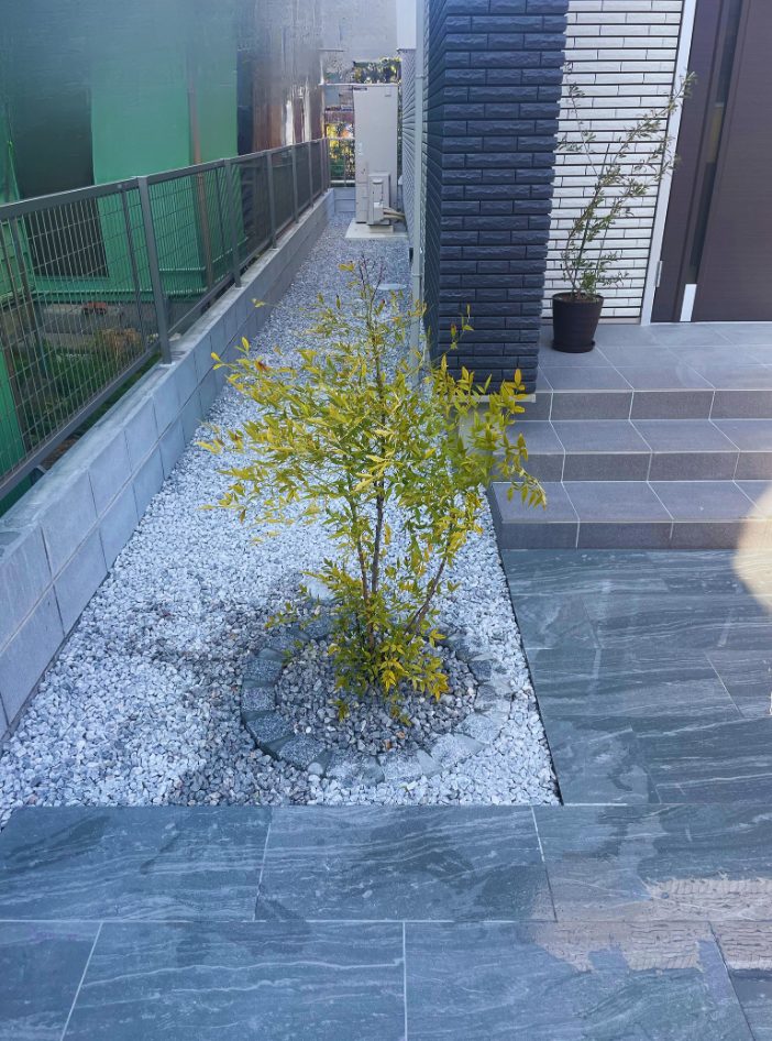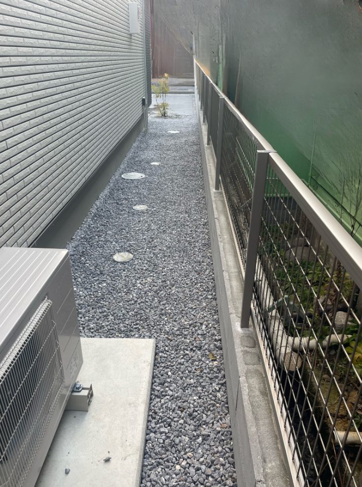おうち周りはグルっと防草シートを貼って砕石を敷きました。