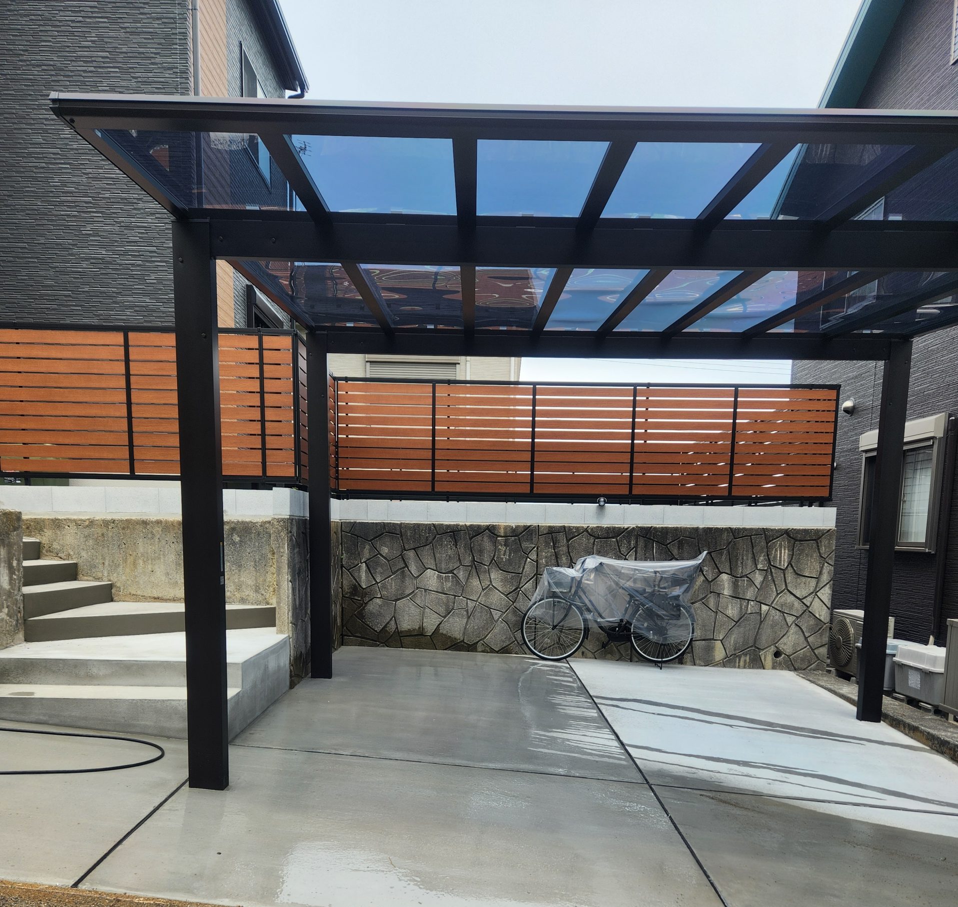 すっきりとしたフラットなデザインのカーポートを採用。車2台分をカバーできるので、雨の日も安心して乗り降りできます。