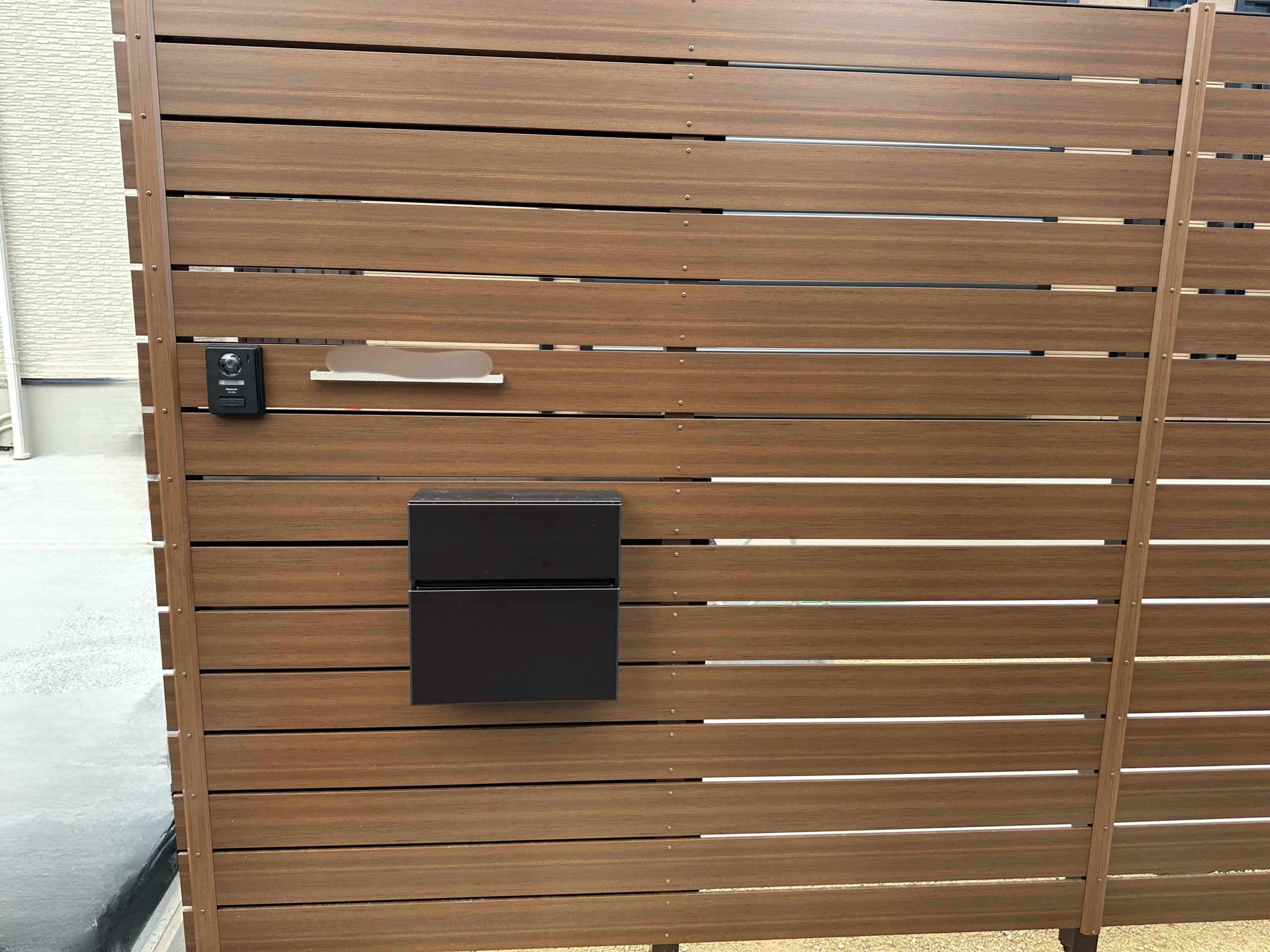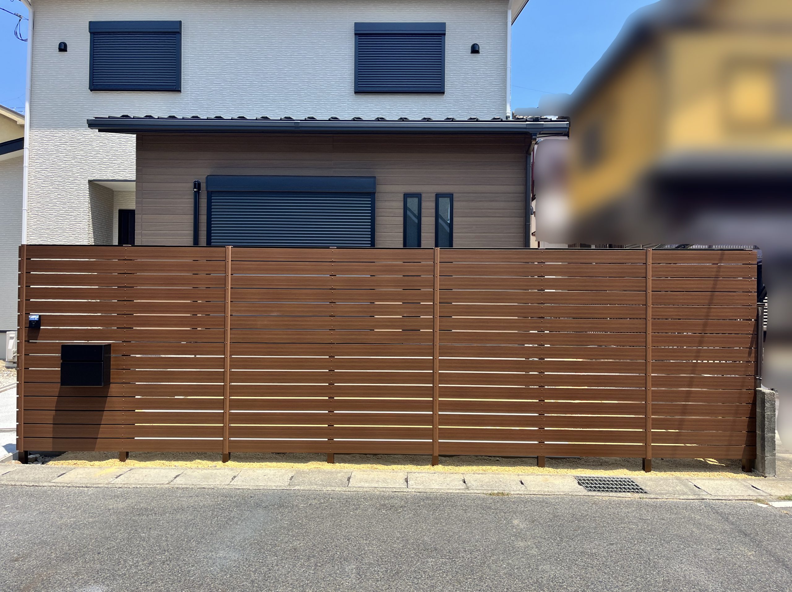 設置したのはF&F「マイティウッド デコⅡ」です。 ポリスチレン製の木調フェンスで、自然木材と違い、経年劣化による変色や腐食をすることなく長い間ご使用できます。 道路に面したお庭をしっかり目隠ししたいので、すき間は10mmで施工しました。