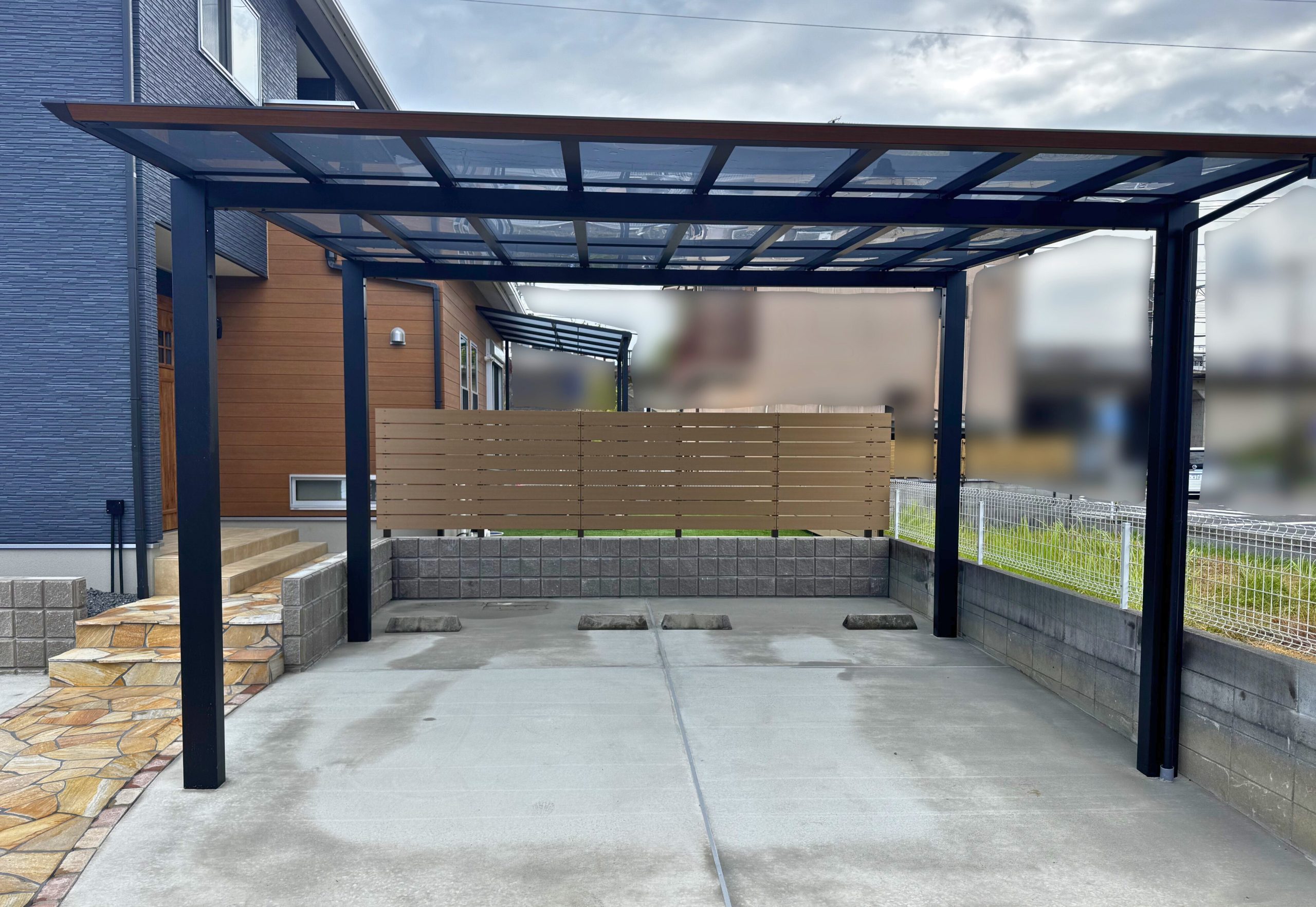 スタイリッシュなカーポートとナチュラルストーンのアプローチ