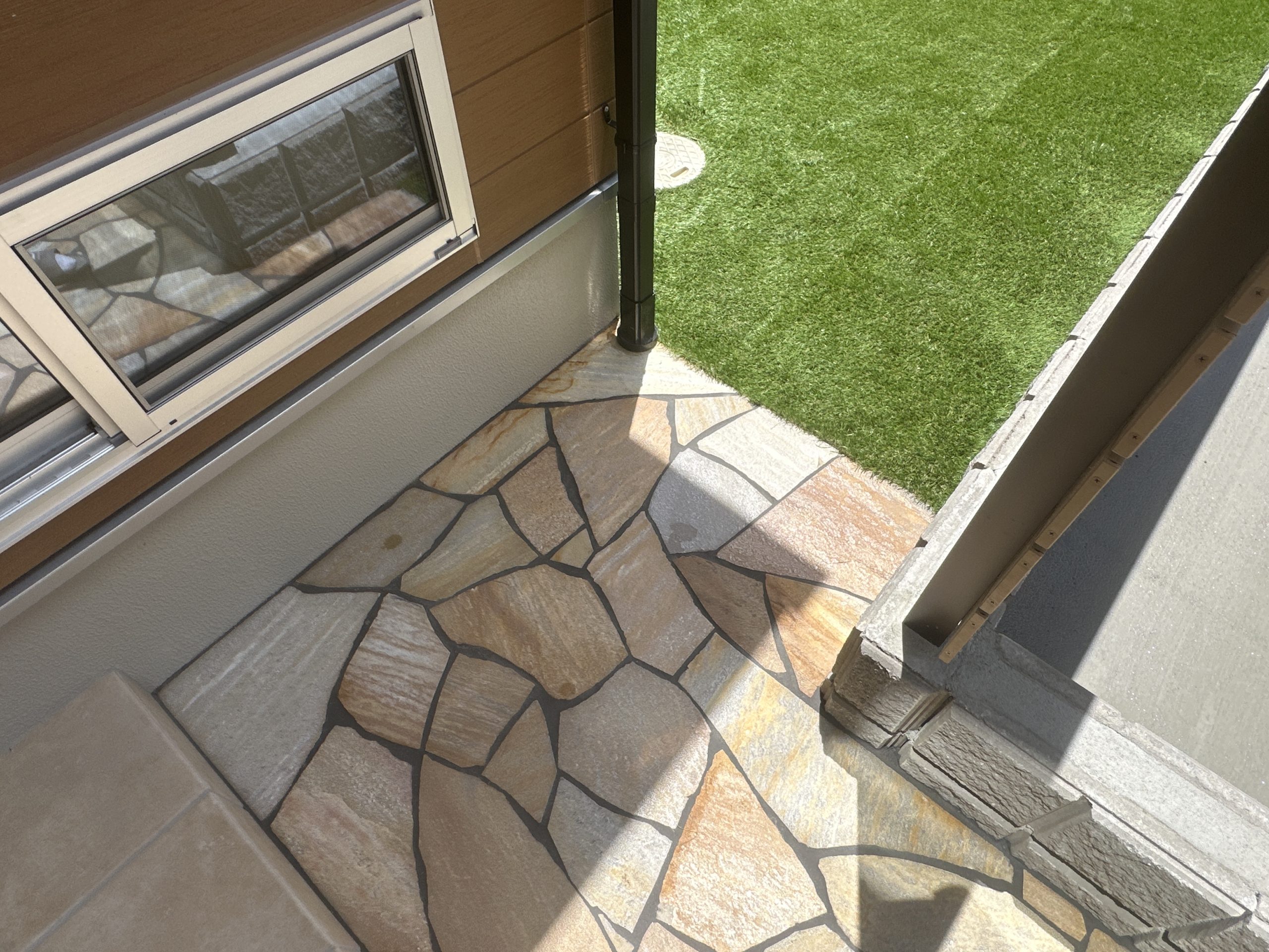 温かみのある乱形石のアプローチはプライベートなお庭まで伸びており、外観全体のアクセントになっています。
