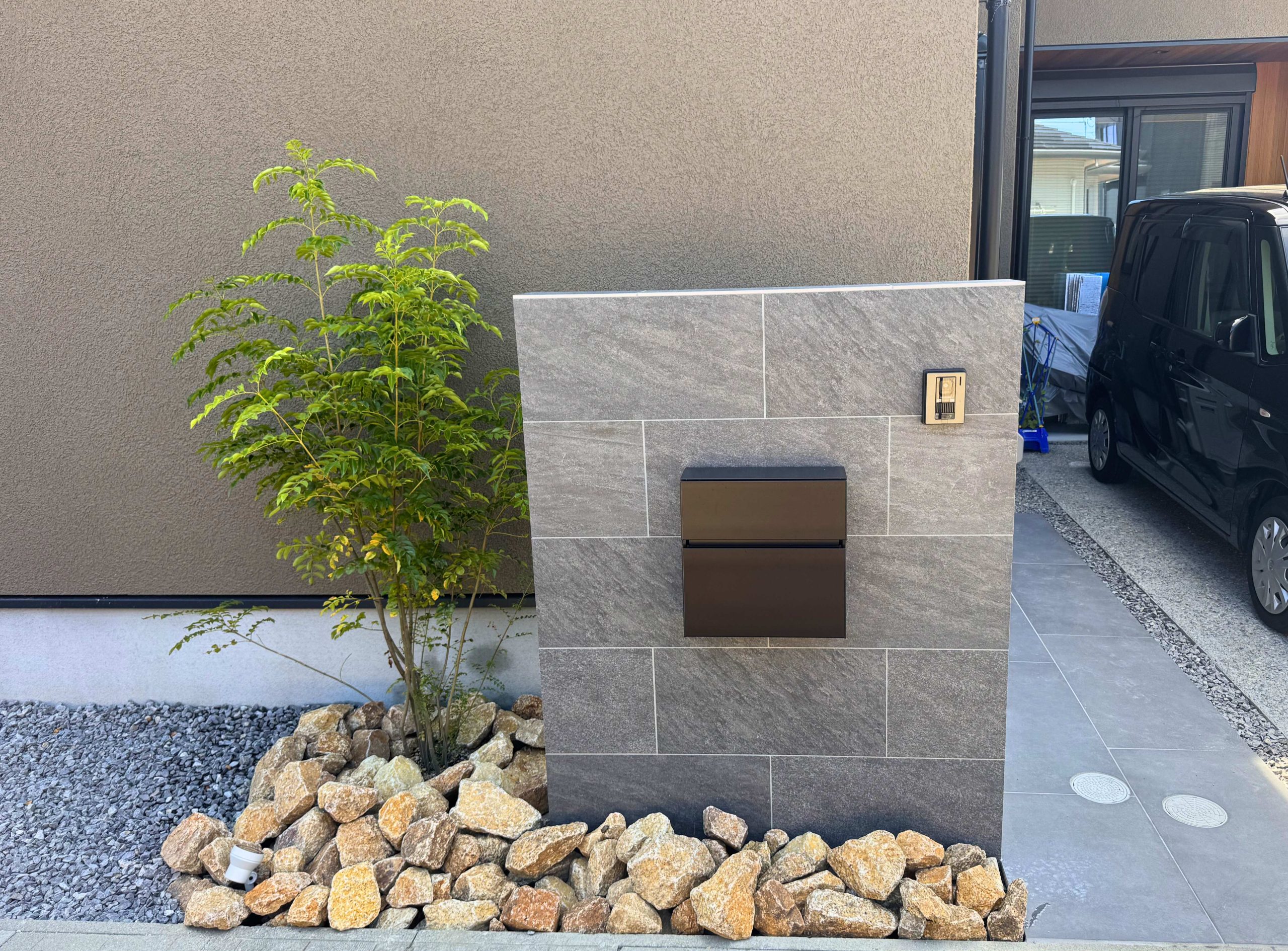 タイル製の壁付けポストは機能的でありながら見た目もすっきり。 周りのロックガーデンは明るい色合いにすることでシンボルツリーの葉が映えます。 景観にとけこむシンプルなデザインのメッシュフェンス。 実際のデザインパースがこちら。