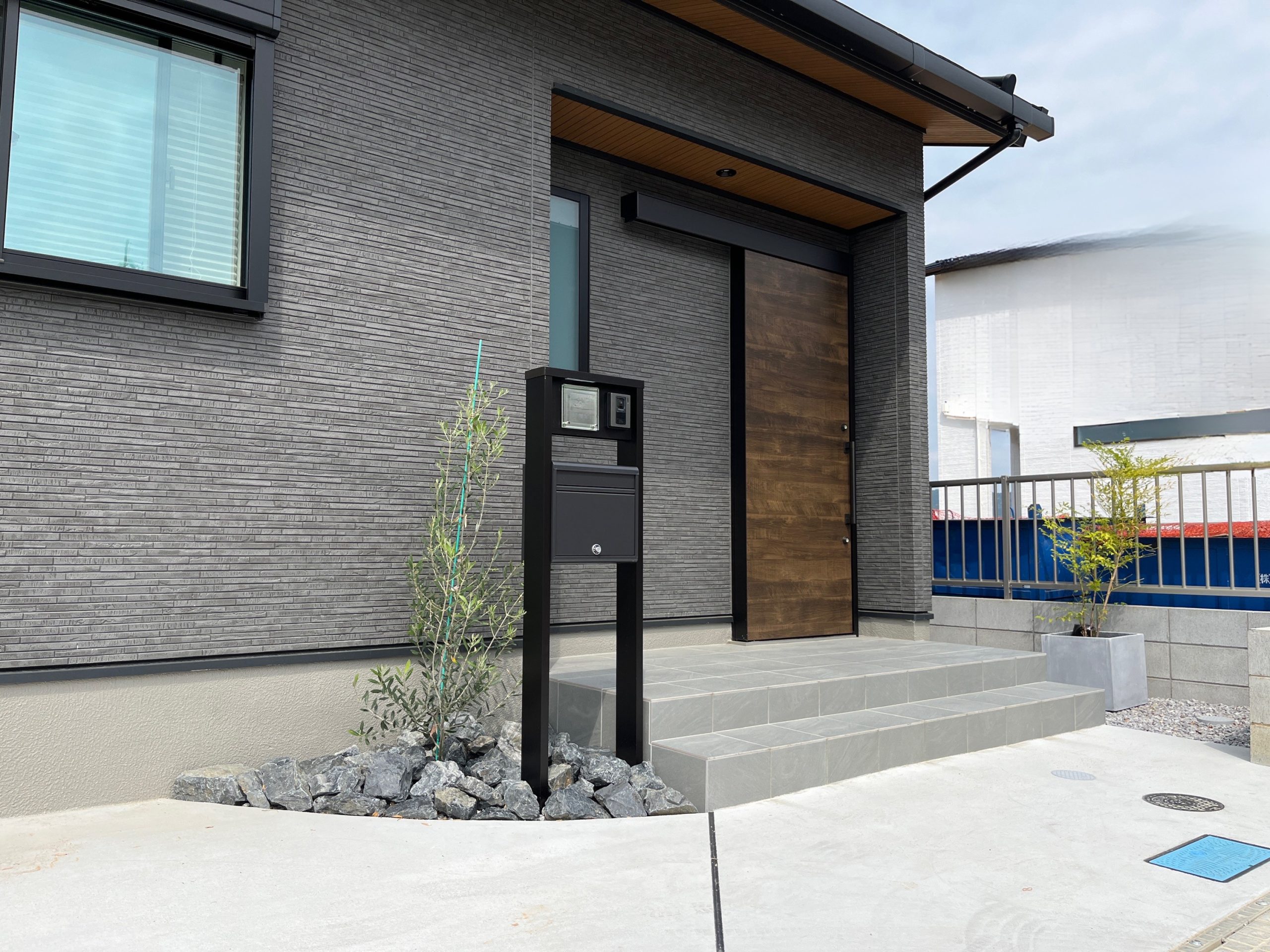 スマートなポストは玄関近くに設置。無機質なコンクリートのアプローチに植栽と植木鉢の緑が惹き立ちます。