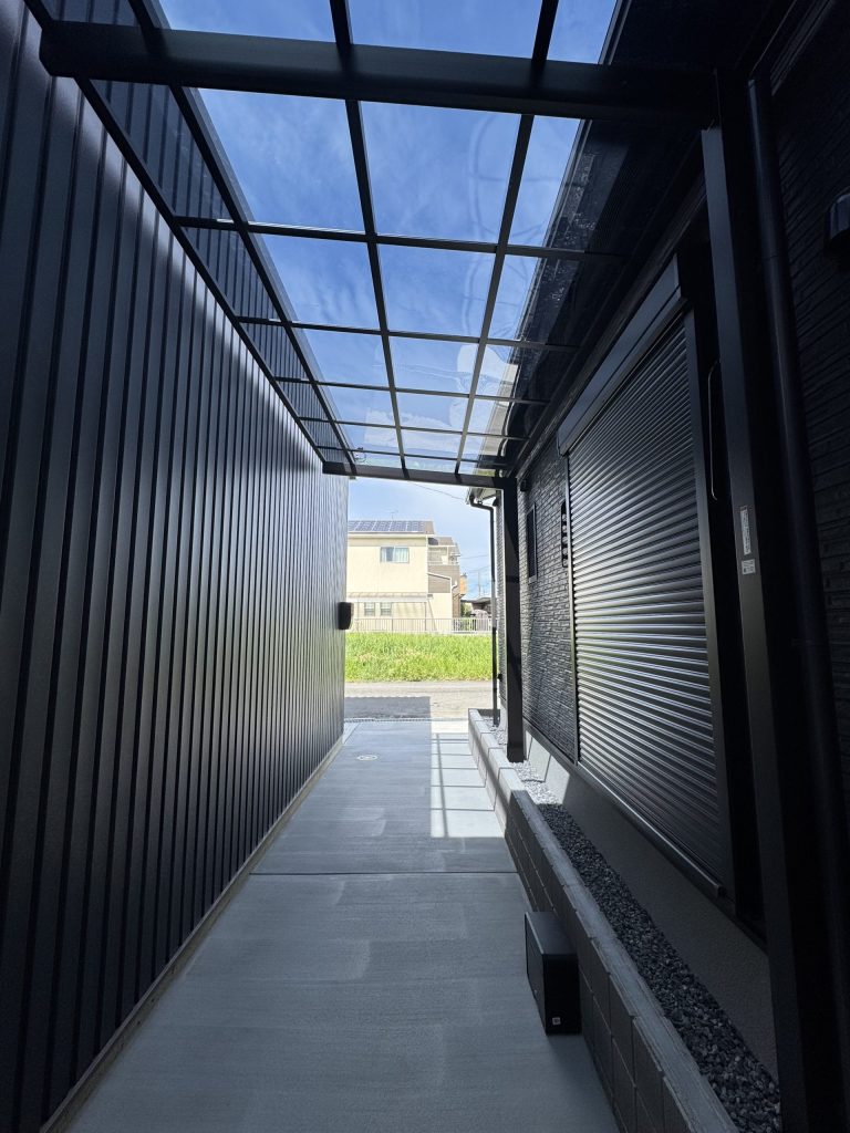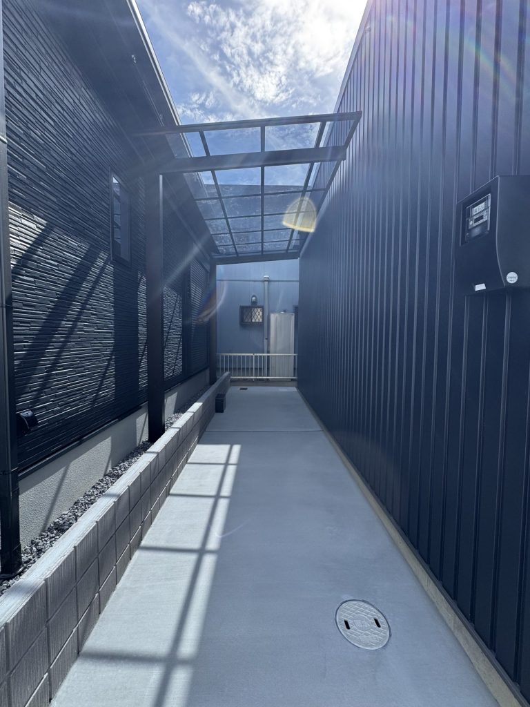 住宅と物置の間にはYKKAPの「エフルージュシングル」