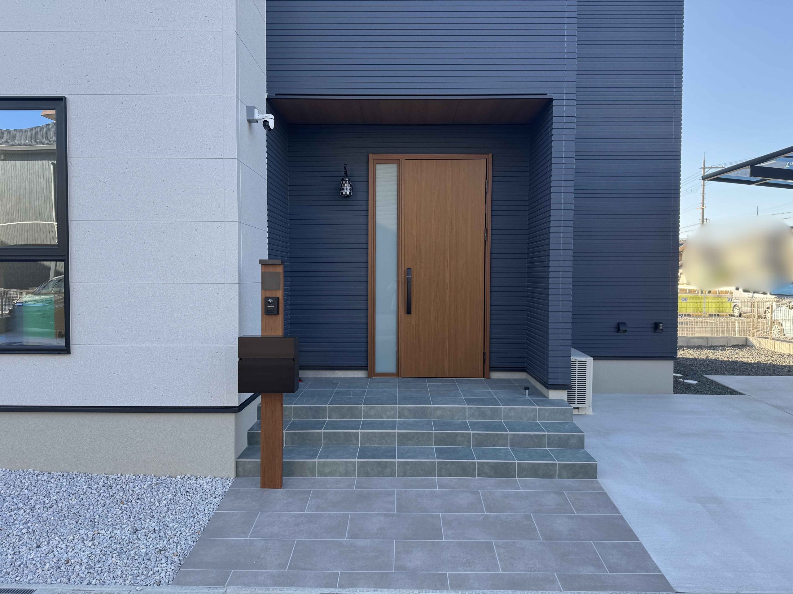 ポストとインターフォンが備え付けの機能門柱はウッディなドアと合わせてあります。玄関アプローチは風合いのあるタイルを敷きました。