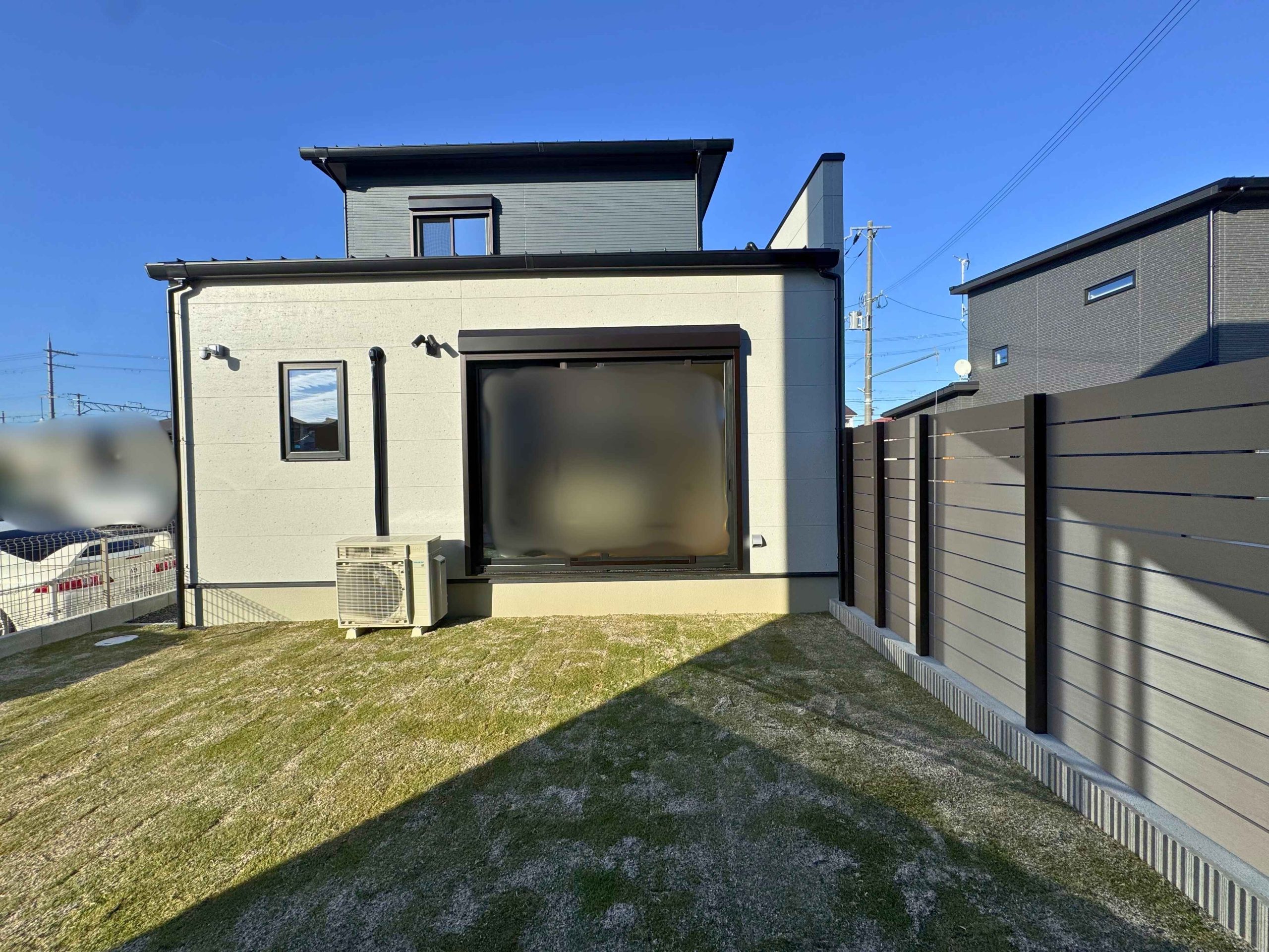 お庭は優しい雰囲気の天然芝を敷きました。人通りがある車道側にフェンスを置くことでホッとするおうち時間を楽しめます。