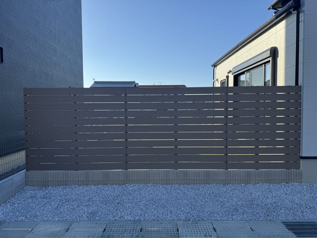 目隠しフェンスを車道から見ると少しの隙間が。敢えて隙間をつくることで風通りを良くします。砕石の下には防草シートを敷いてあるのでお手入れが楽ちんです。