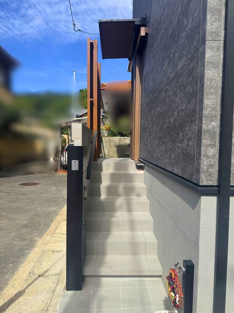玄関と道路の幅が狭いので、スリムな機能性門柱でカバーしました。階段を一段追加してあります。