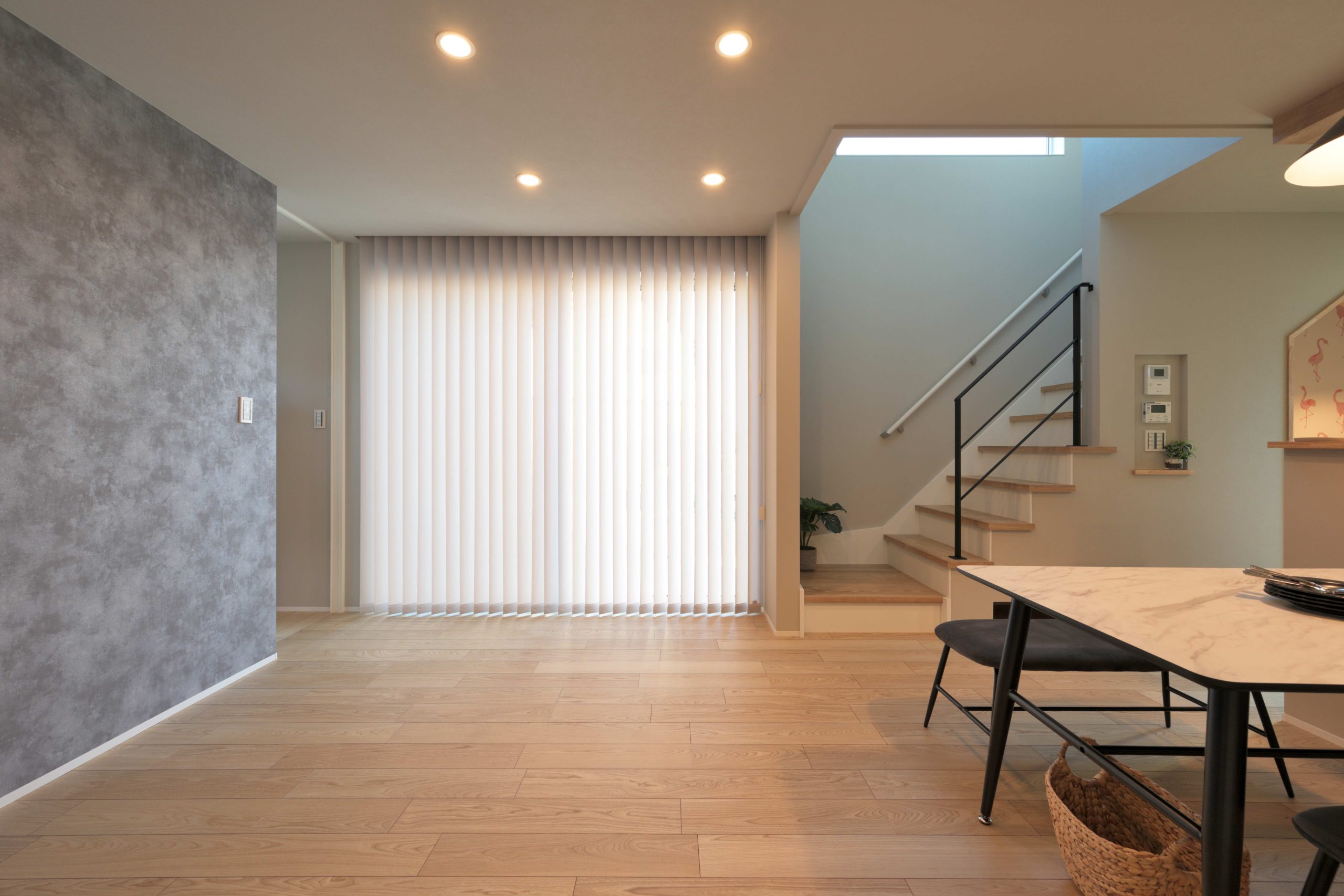 アイアン手摺(てす)りを施した吹き抜け階段。