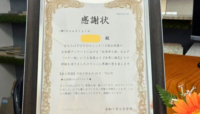TOTOユニットバス組立者認定制度事務局様より感謝状が届きました。 TOTOユニットバス組立現場にて、お客様から「非常に満足」との評価を頂き、表彰していただきました。 光栄に思うとともに、これからもお客様のためにひとつひ … 続きを読む TOTOユニットバス組立者認定制度事務局様より感謝状が届きました